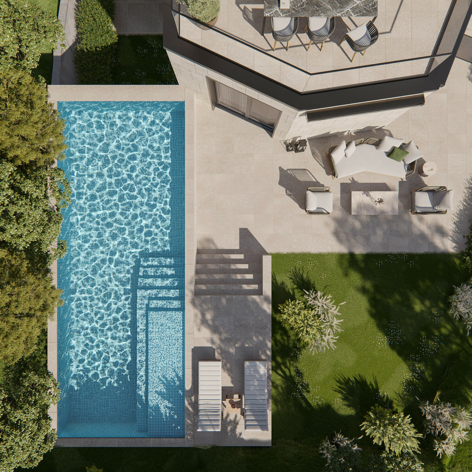 Das Volumen hebt sich, von kleinteiligen Erkern und Gartennischen flankiert, die zwischen Bau und Landschaft behutsam artikulierte Räume schaffen, empor. Das plastische Gebäude ist in eine feine Keramikhülle gefasst, welche, im Zusammenspiel mit den schwerelosen Glasbrüstungen und den filigranen, dunklen Metallarbeiten, dem Volumen eine leichte, grazil mediterran angehauchte Skulpturalität entlockt. Im dezent, durch ein schwebendes Glasband abgesetzten Sockel, sind Garageneinfahrt und Eingang der drei darüberliegenden Wohnungen eingelassen. Die Glasbrüstungen nehmen sich optisch zurück und werden mit einem feinen Metallband gekrönt, so dass sie nicht nur freie Sichtbezüge aus dem Inneren offerieren und den Baukörper als Ganzes zur Geltung lassen kommen, sondern sorgen auch für optimierten Schallschutz der luxuriösen Wohnungen. Die Erschliessung erfolgt über einen zentralen, gerundeten Treppenkern, welcher ein plastisches Raumerlebnis schafft, wobei die umfliessende Raumzirkulation optimiert wird.
